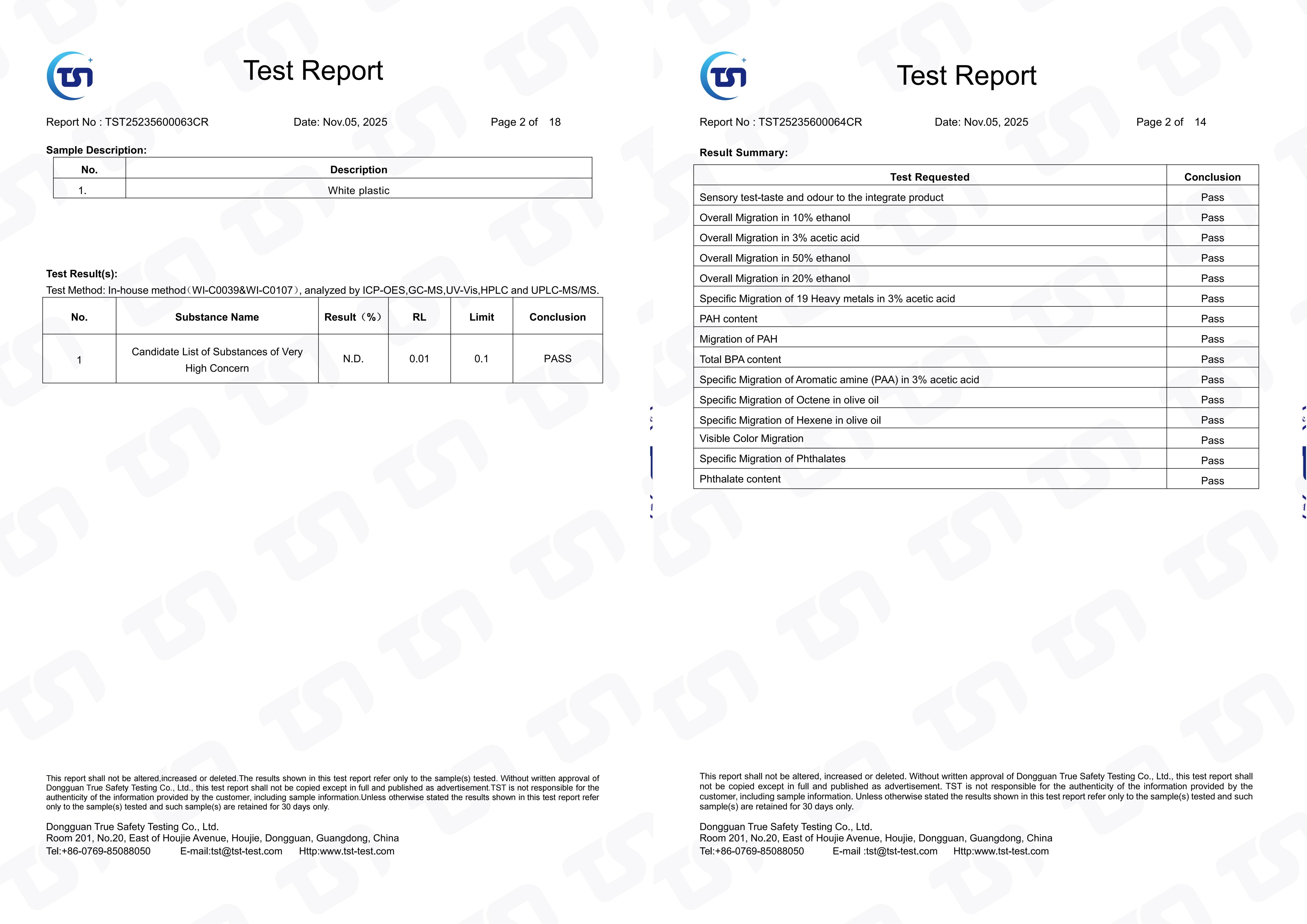 The testing program covered key European regulations governing chemical safety and food-contact materials, including: REACH Regulation 1907/2006, (EU) No. 2017/752, (EU) No. 2024/3190, (EU) No. 2020/1245, (EU) No. 10/2011, and (EC) No. 1935/2004. Across all scopes evaluated, UMETASS plastic pails met the applicable requirements.
